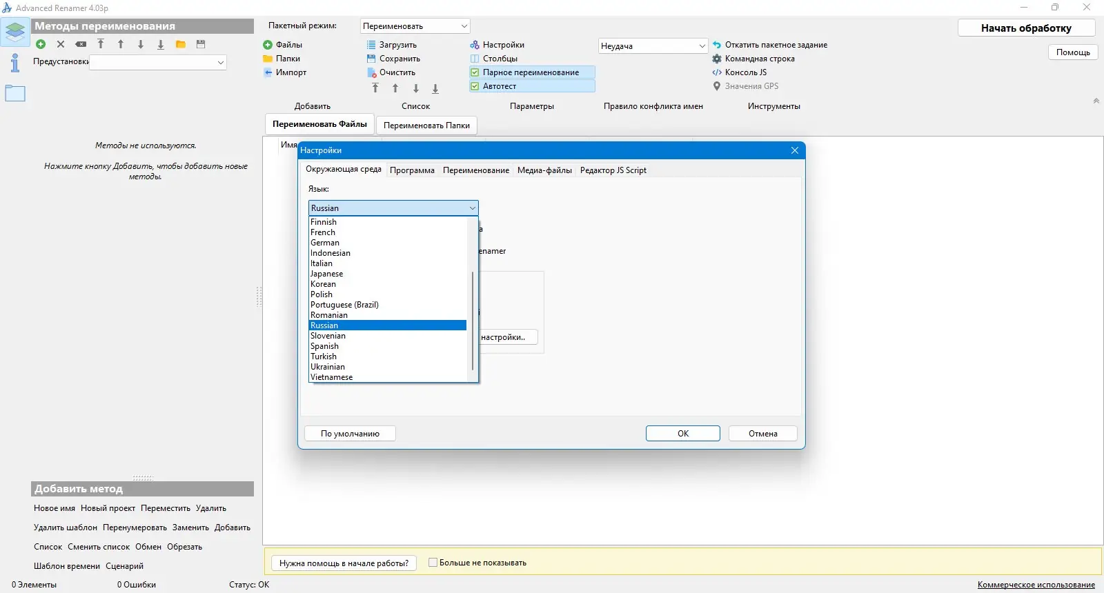 Advanced Renamer выделяется на фоне аналогичных утилит благодаря сочетанию функциональности и производительности. Программа не требует установки в систему и работает стабильно даже с тысячами файлов. Реализована возможность отмены последних операций, что повышает надёжность. Интерфейс интуитивно понятен, хотя полное раскрытие потенциала требует изучения всех доступных методов. В то же время, отсутствие официальной русской локализации от разработчика может стать небольшим препятствием для новичков, однако сообщество предоставляет пользовательский перевод, который легко подключается вручную.