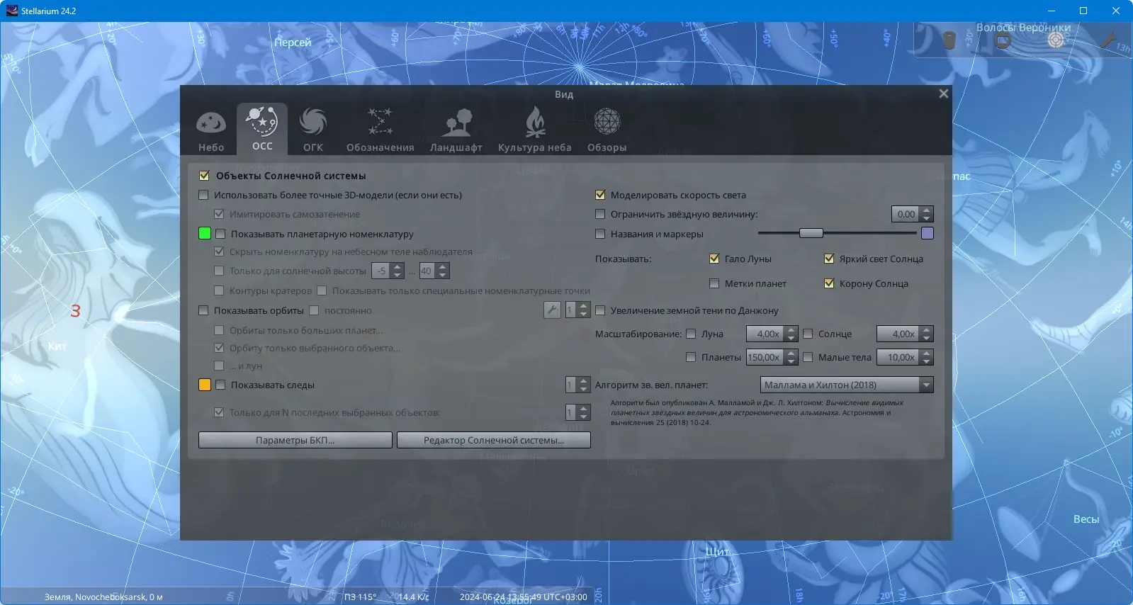 - Поддерживается рендеринг планет с их спутниками и отображение координат, названий и других параметров объектов.