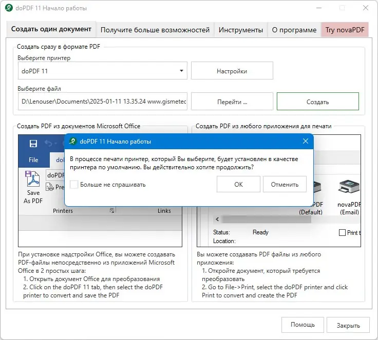 Преобразование в PDF происходит мгновенно — достаточно выбрать doPDF в списке принтеров и отправить документ на печать.