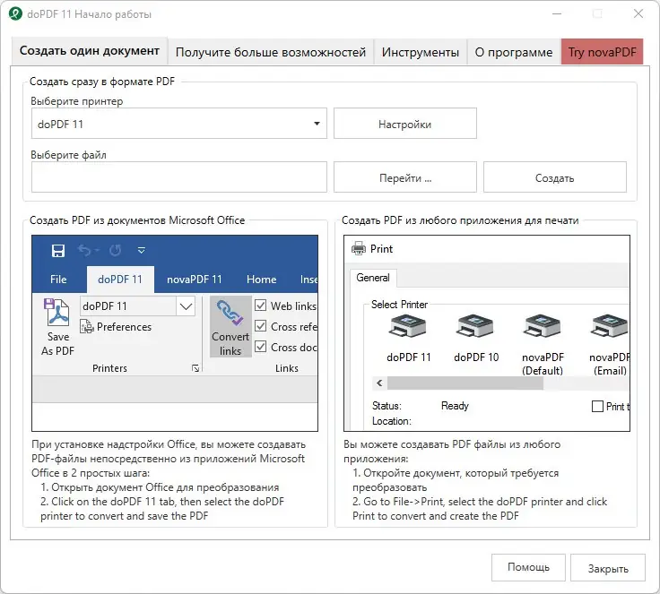 doPDF — это утилита для преобразования документов в формат PDF, работающая через виртуальный принтер. Программа поддерживает широкий спектр входных форматов и подходит как для домашнего, так и для офисного использования.