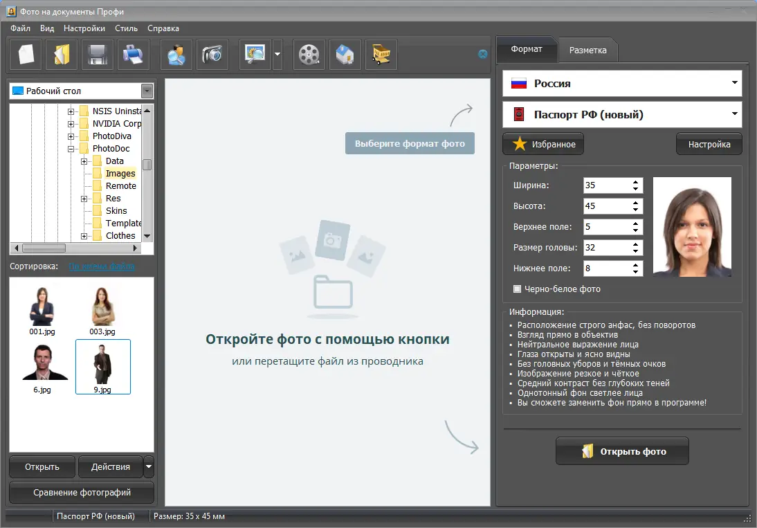 - Поддерживает точные размеры и требования к фото для внутреннего и заграничного паспорта.