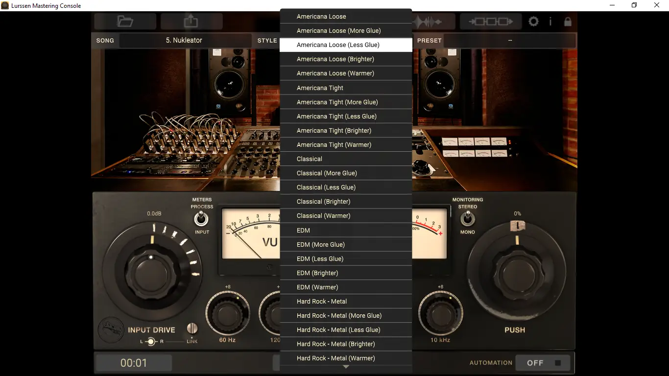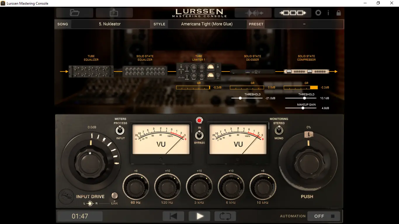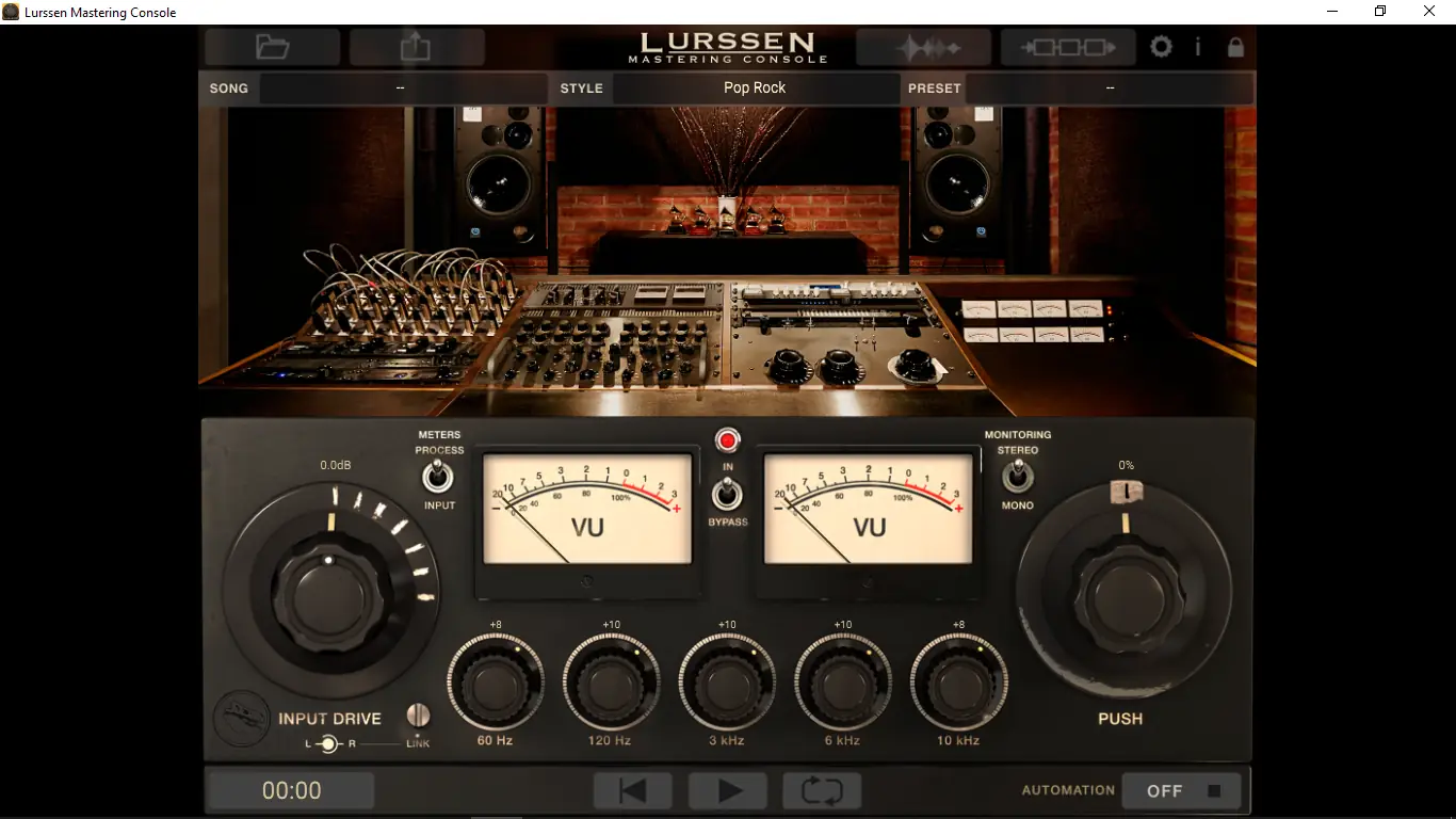 Использование Lurssen Mastering Console начинается с выбора подходящего стиля обработки, который автоматически настраивает сигнальный путь и параметры всех встроенных процессоров. После загрузки аудиофайла или подключения к проекту в DAW пользователь может регулировать три основных параметра: Input Drive, пятиполосный эквалайзер и ручку PUSH, отвечающую за тонкую коррекцию динамики и пространственного ощущения. Ручка PUSH позволяет мягко «подсвечивать» определённые частотные диапазоны, усиливая энергетику композиции без перегрузки. Функция автоматизации позволяет записывать движения ручек в реальном времени, что особенно полезно при поиске идеального баланса на разных участках трека. Переключатель bypass помогает сравнивать обработанный и исходный сигнал, а режим стерео/моно — контролировать совместимость микса.