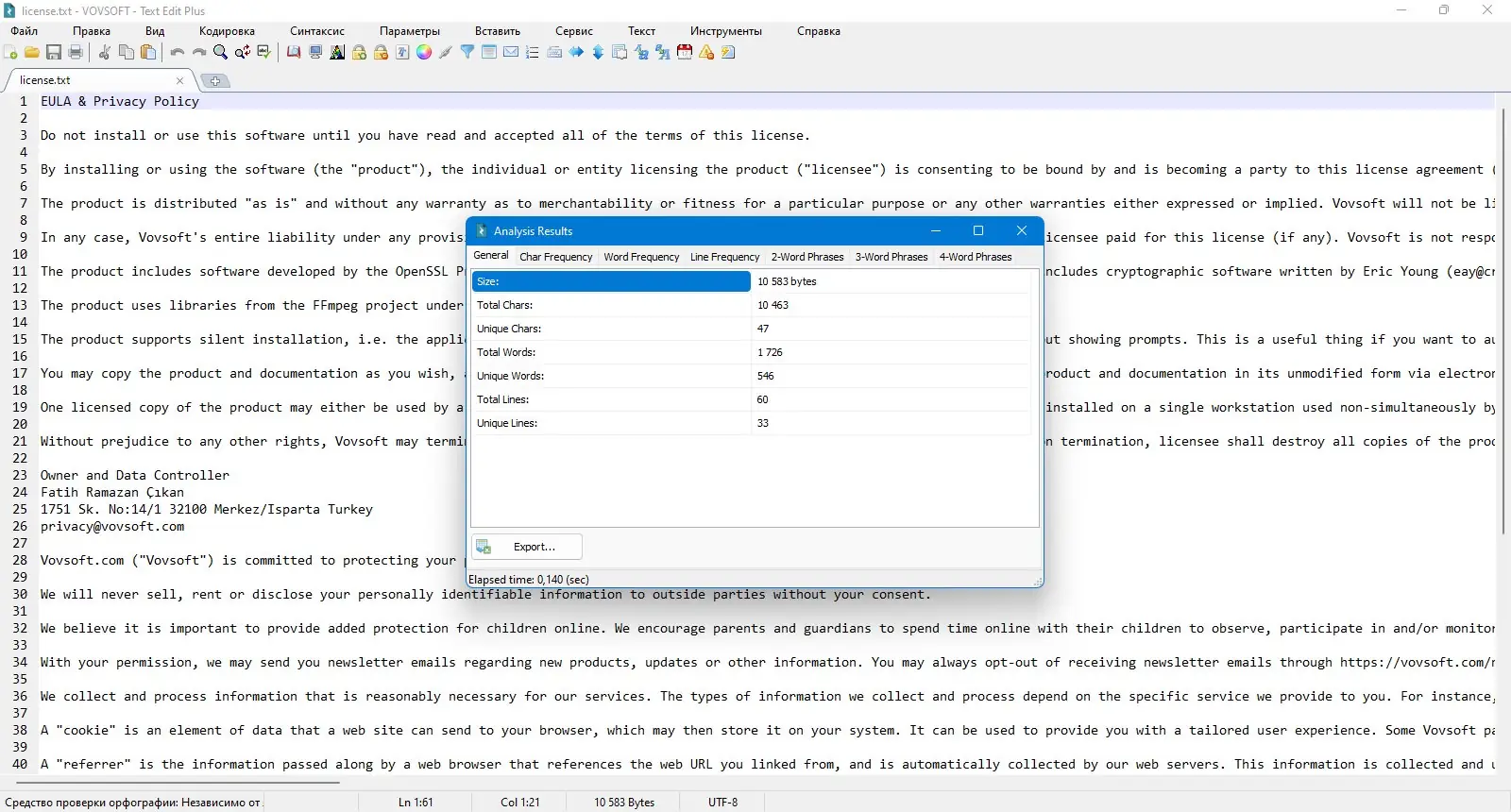 - Обладает встроенным модулем анализа текста для быстрого получения статистики.