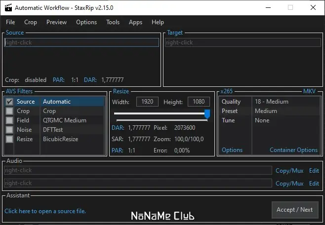 Интерфейс StaxRip построен таким образом, чтобы упростить процесс кодирования даже для начинающих пользователей, при этом не ограничивая продвинутых функционалом. После добавления исходного видеофайла, программа автоматически анализирует его структуру, предлагая оптимальные настройки для перекодирования. Работа с аудио и видео дорожками осуществляется через интуитивно понятные вкладки, где можно выбрать режим копирования, перекодирования или отключения.