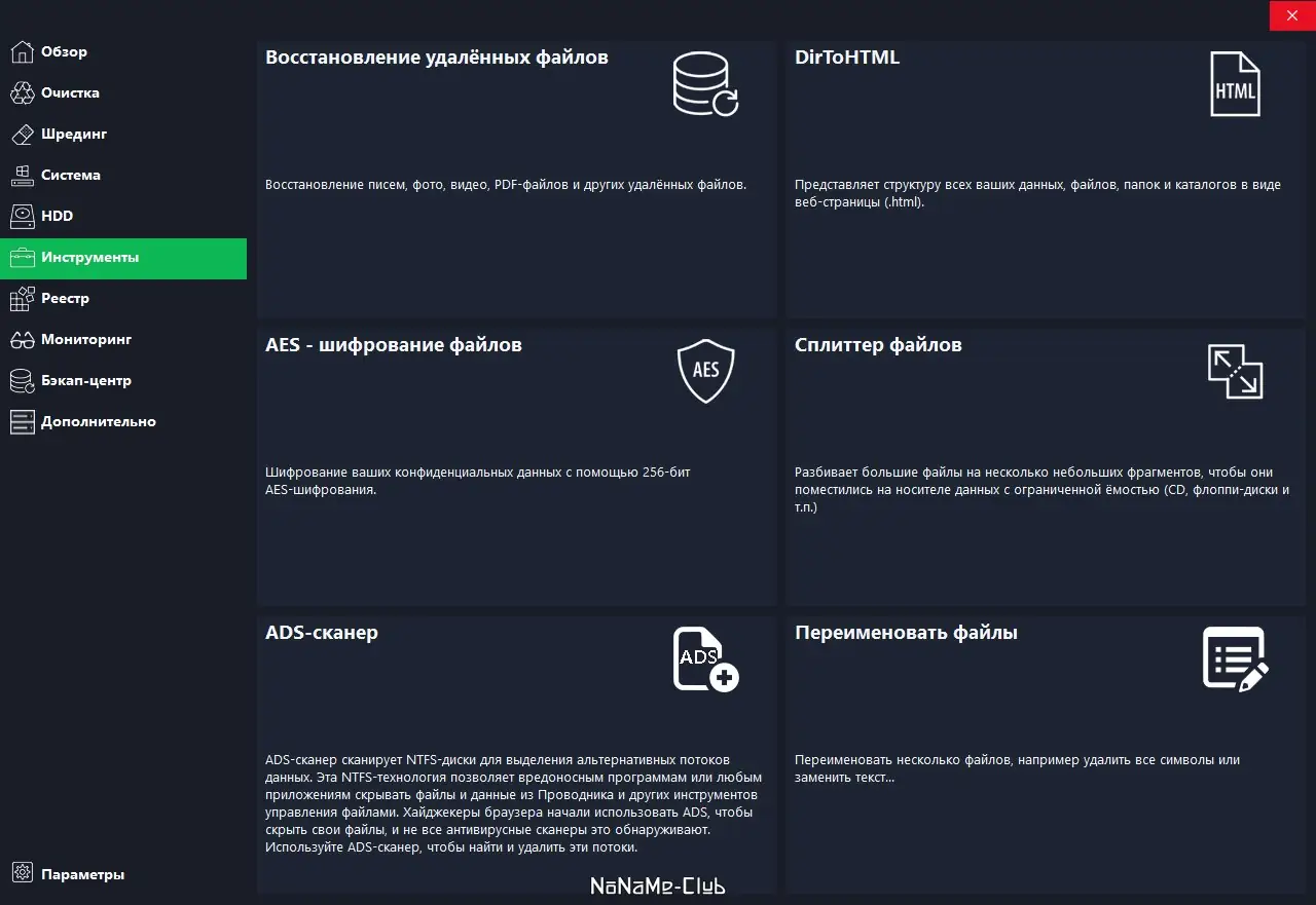- Функция затирания удалённых файлов с помощью продвинутых алгоритмов обеспечивает безопасное удаление конфиденциальной информации.