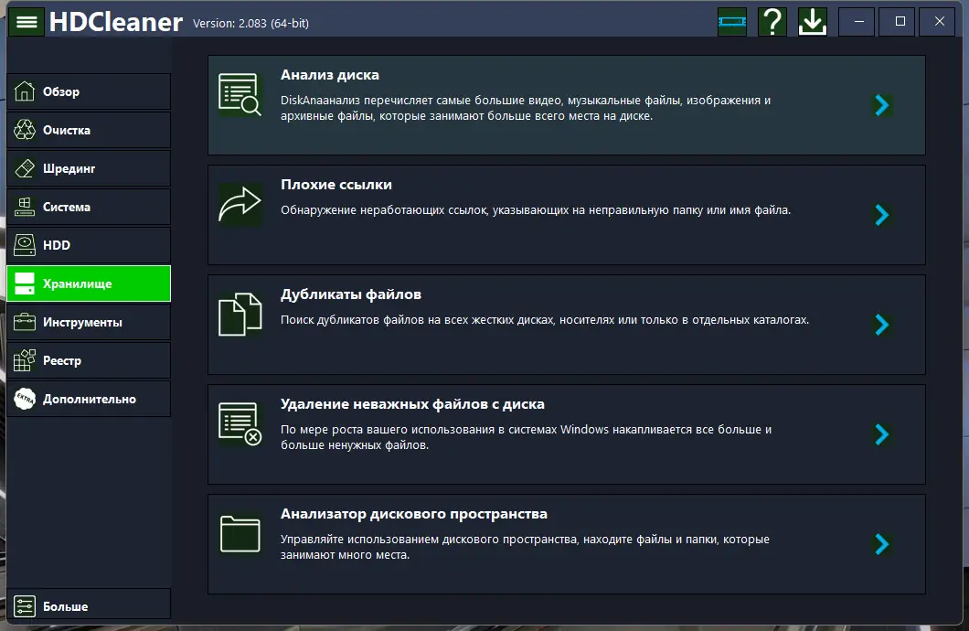 HDCleaner сочетает в себе мощный функционал и простоту использования, что делает его подходящим как для начинающих, так и для продвинутых пользователей. Программа предлагает широкий набор инструментов, позволяя эффективно управлять состоянием системы. При этом она остаётся легковесной и не нагружает ресурсы компьютера во время работы.