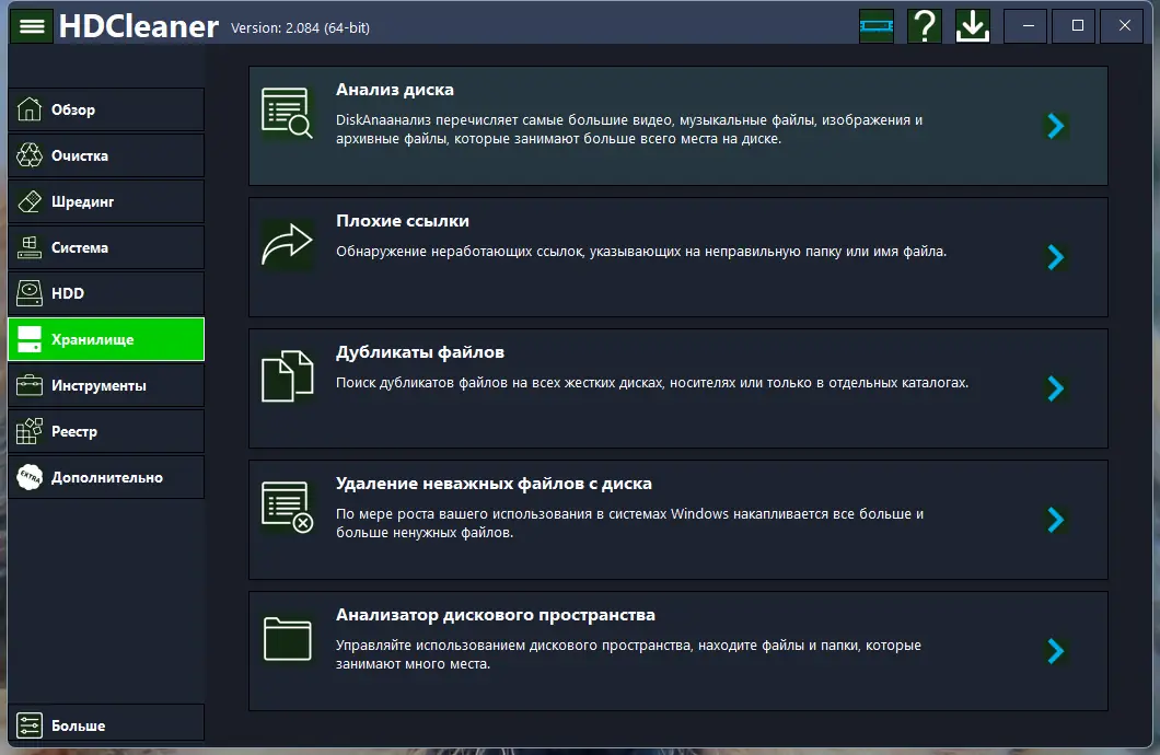 HDCleaner — это комплексная система оптимизации ПК, созданная как бесплатная альтернатива CCleaner. Утилита объединяет в себе широкий набор инструментов для поддержания чистоты и стабильности операционной системы. Она совместима с различными версиями Windows и работает с HDD и SSD одинаково эффективно.