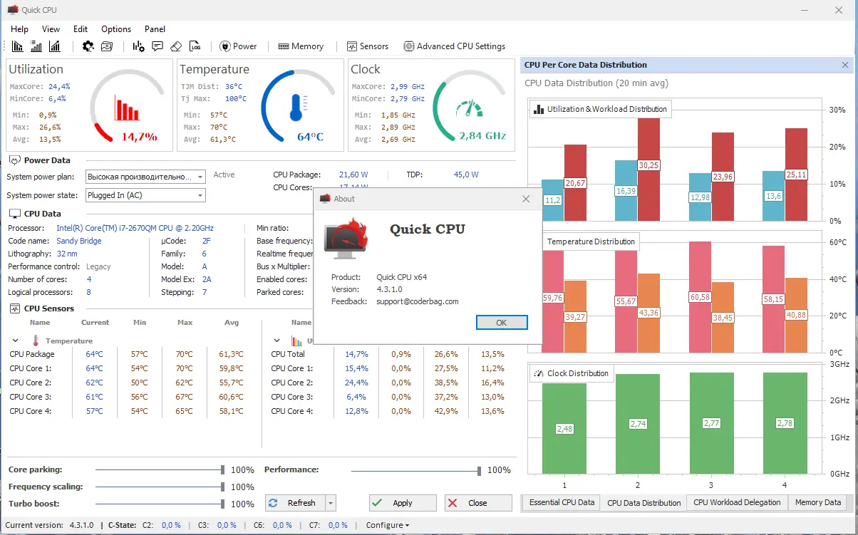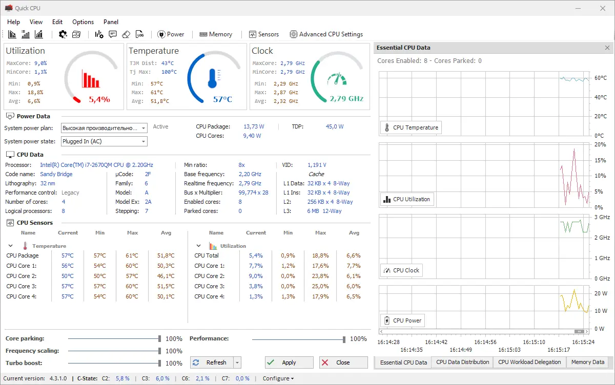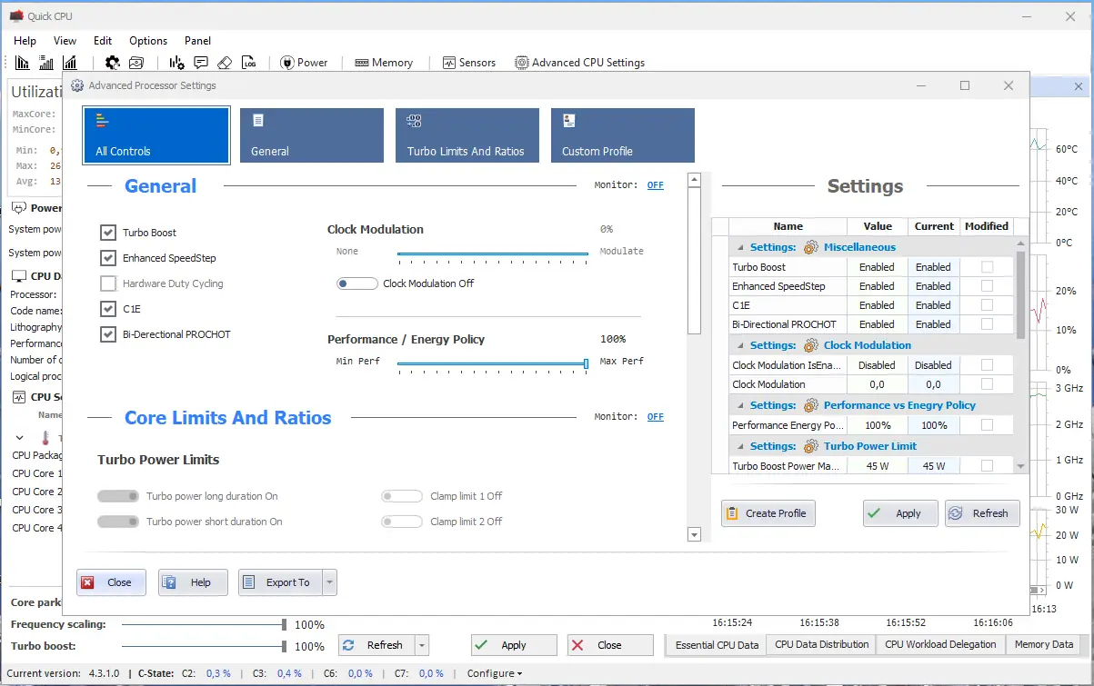 Quick CPU — это инструмент для детального контроля над процессором, позволяющий настраивать параметры энергопотребления, производительности и теплового режима в реальном времени. Программа подходит для продвинутых пользователей, стремящихся оптимизировать работу системы без необходимости перезагрузки. Благодаря широкому функционалу она активно используется при тестировании и тонкой настройке оборудования.