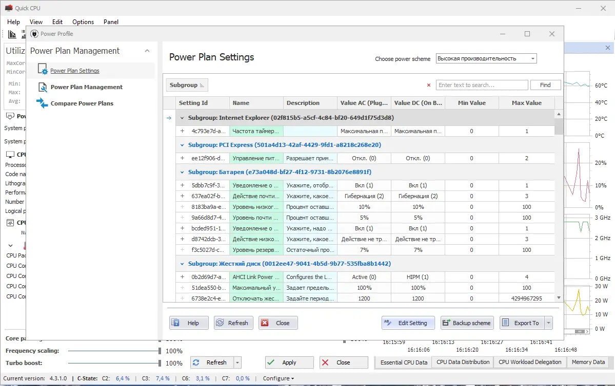 - Контроль за парковкой ядер процессора для баланса между производительностью и энергопотреблением