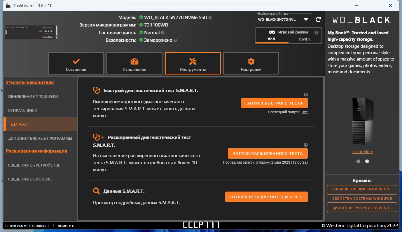 - Возможность обновления прошивки и контроля за износом диска
