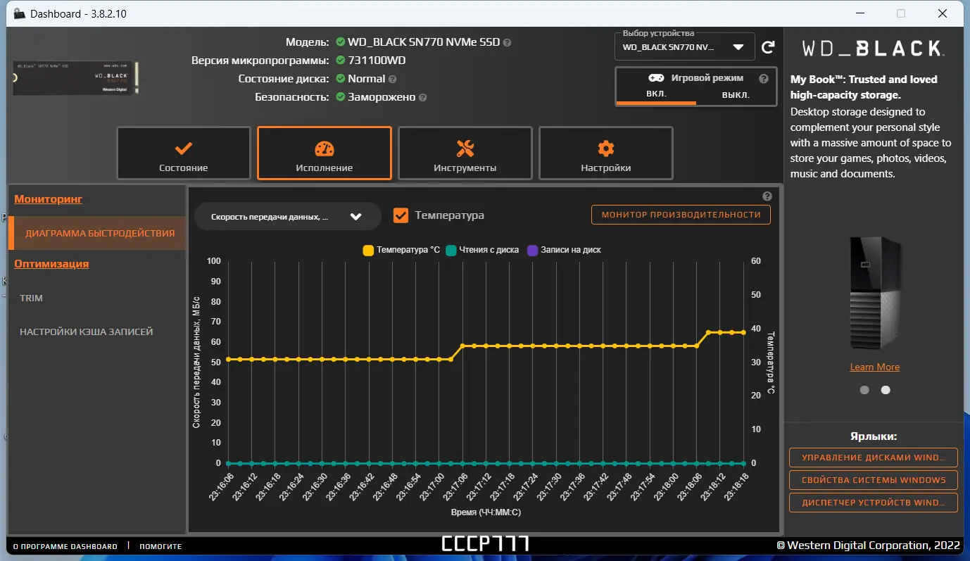 - Отображение текущей температуры и прогнозируемого срока службы SSD