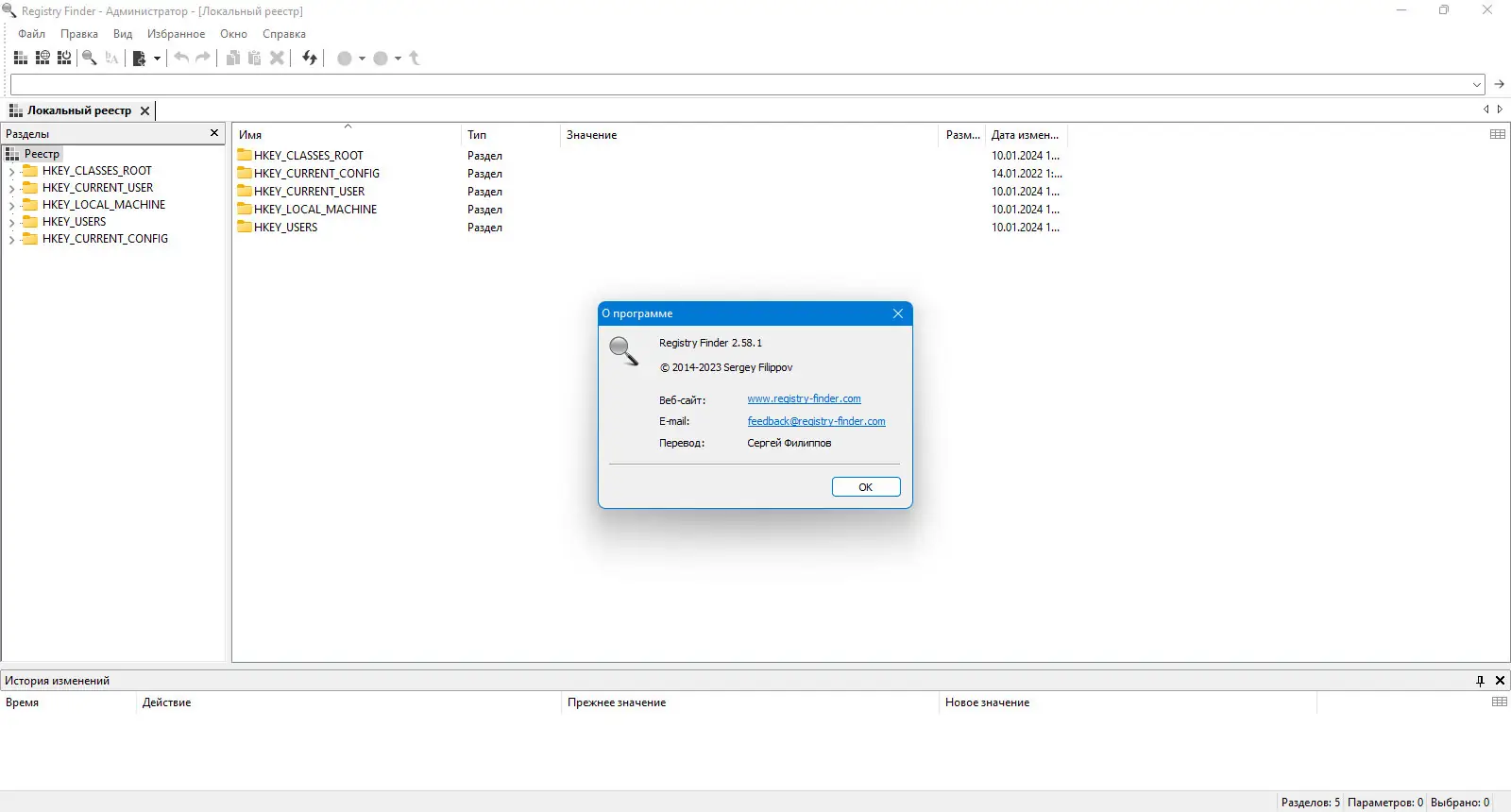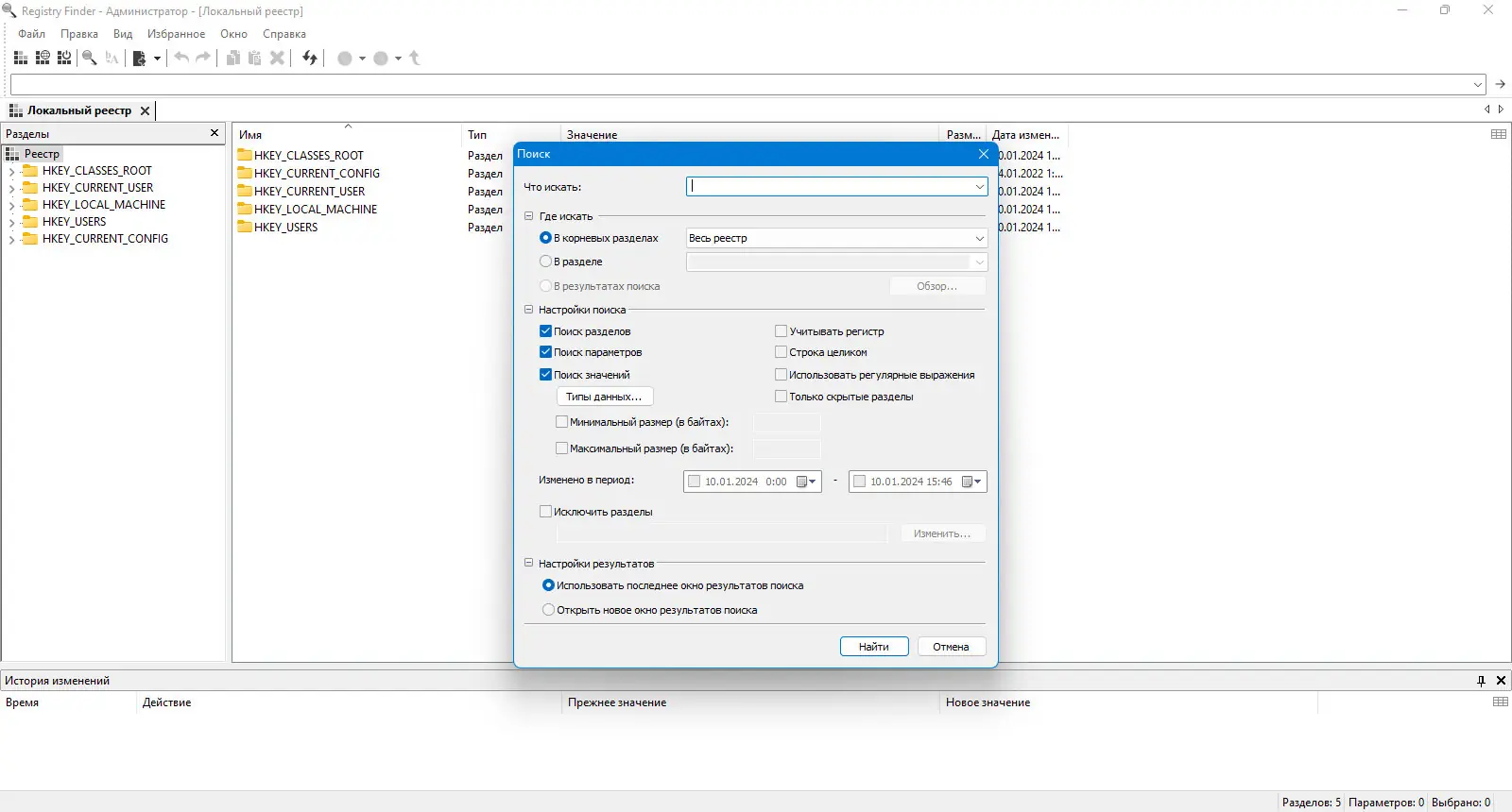 - Поддержка поиска по ключам, параметрам, значениям и описаниям в реестре.