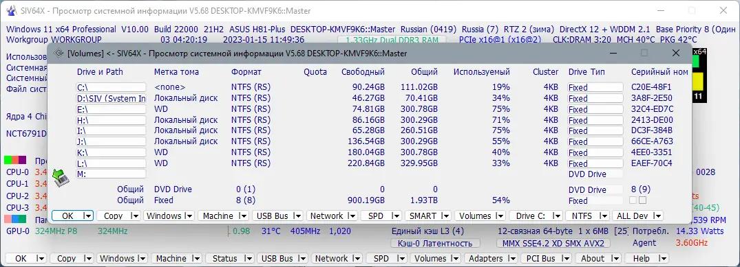 - Анализ состояния жёстких дисков, включая объём, тип накопителя и скорость передачи данных.