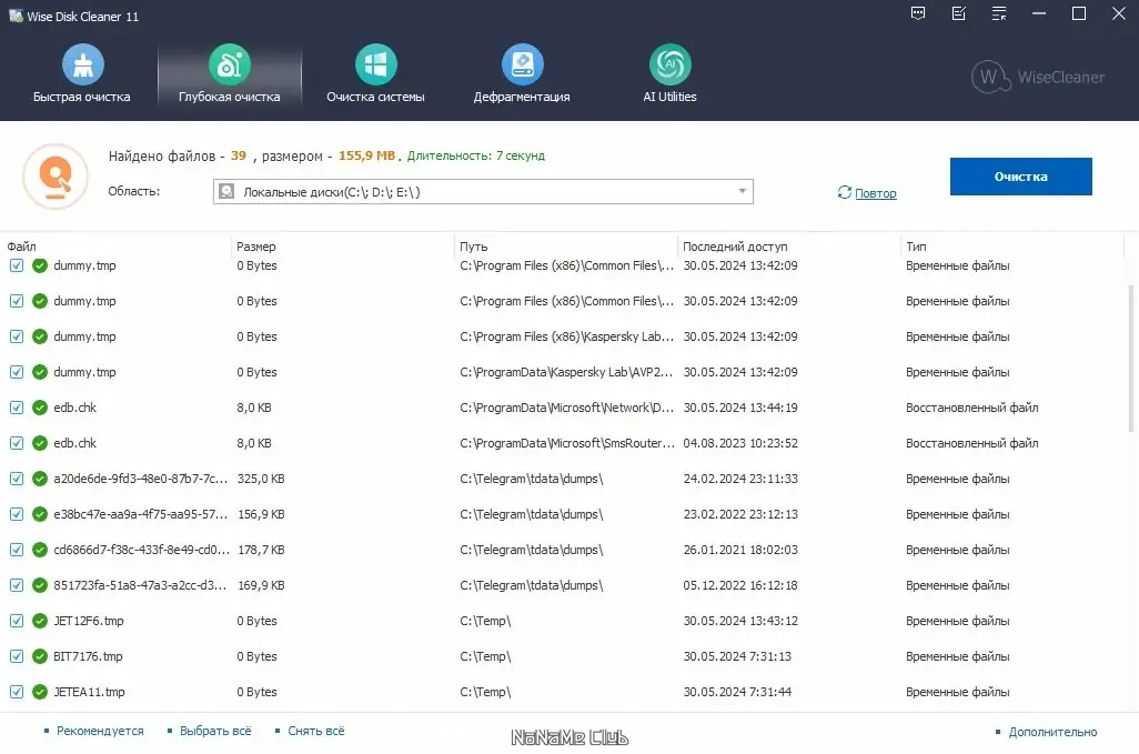 - Осуществляет глубокое сканирование на наличие временных и ненужных файлов, включая данные из системных папок и приложений.