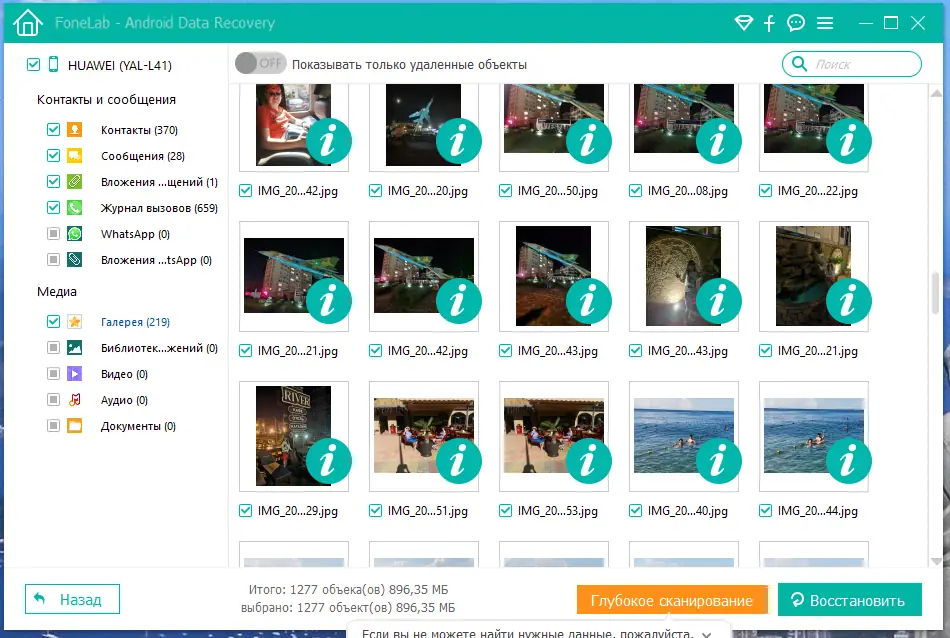 - Восстановление удалённых фотографий, видео и аудиофайлов с внутреннего накопителя или SD-карты