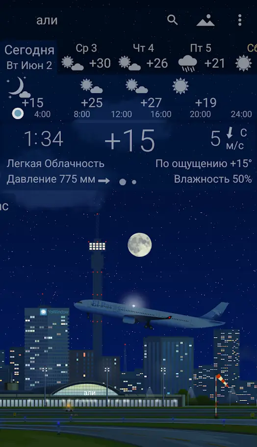 - Приложение отображает погоду через живую анимацию, меняющуюся в зависимости от времени суток и погодных условий.