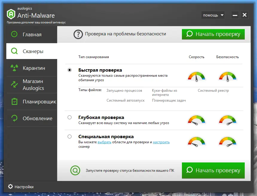 Auslogics Anti-Malware — это дополнительное решение для защиты компьютера, способное работать параллельно с основным антивирусом. Программа сканирует систему на наличие скрытых угроз, включая шпионское ПО, трояны, рекламное программное обеспечение и нежелательные расширения браузеров. Она эффективно дополняет встроенные средства безопасности, обеспечивая более глубокий анализ уязвимых областей операционной системы.