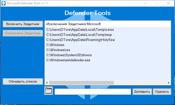 Использование утилиты не требует специальных знаний. После запуска откроется окно с кнопками включения и отключения Защитника. Для добавления исключений нужно выбрать соответствующую вкладку, указать путь к файлу или папке и подтвердить действие. Программа также поддерживает командные ключи, например, можно запустить «d:MyExclusionPath.txt» — чтобы добавить исключения из текстового файла в скрытом режиме. Обновлённый механизм включения и отключения Защитника в версии v 1.1 обеспечивает более стабильную работу и устраняет возможные ошибки предыдущих сборок.