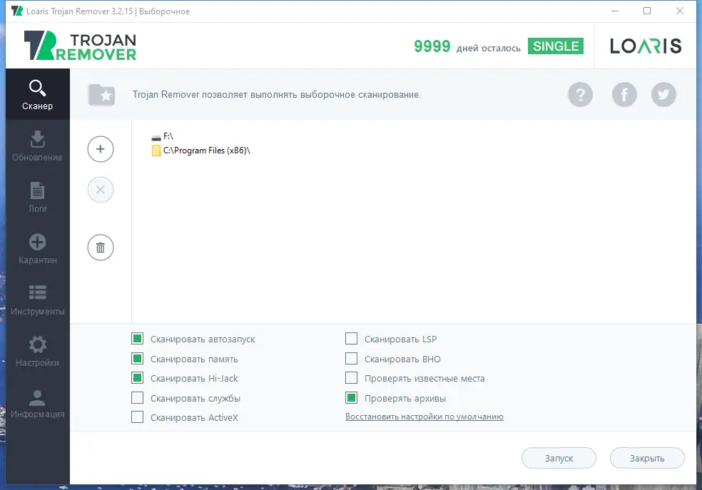 Перед началом сканирования обязательно добавьте папку с программой в исключения антивируса, чтобы избежать ложных срабатываний и блокировки процесса.