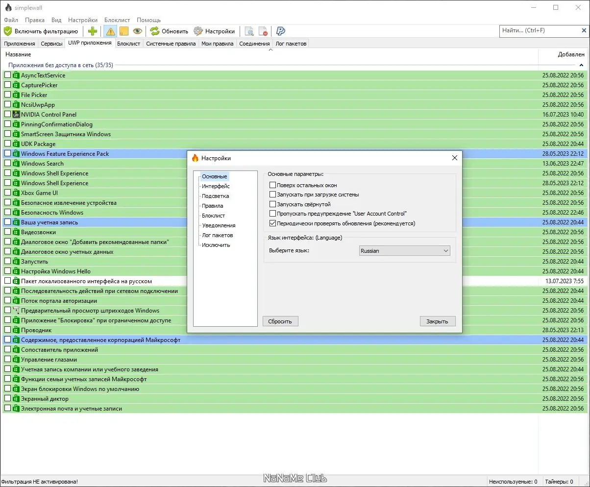 Простой и легковесный firewall для Windows, работающий на базе встроенной платформы фильтрации пакетов. Утилита позволяет контролировать сетевую активность приложений, блокируя трафик по черным или белым спискам. Программа не требует установки и доступна в portable-версии, что делает её удобной для использования на разных устройствах.