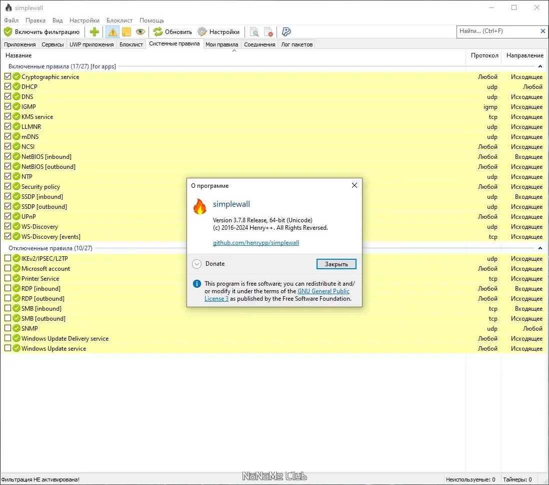 Simplewall — это компактный firewall, предназначенный для управления сетевыми подключениями в системе Windows. В отличие от многих аналогов, он не перегружен функциями, но при этом предоставляет всё необходимое для эффективного контроля над трафиком. Работа осуществляется через Windows Filtering Platform, что обеспечивает глубокую интеграцию с операционной системой и минимальное влияние на производительность.