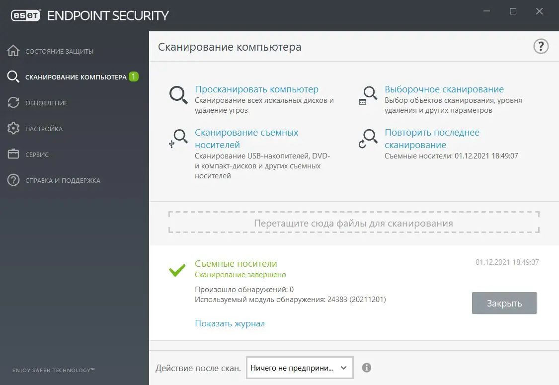 - Поддерживает управление сменными носителями, включая возможность блокировки устройств и автоматического сканирования.