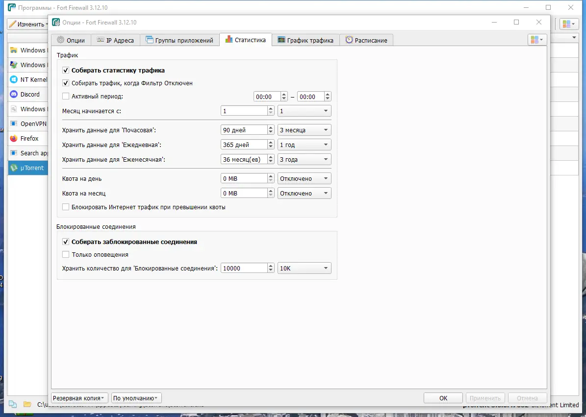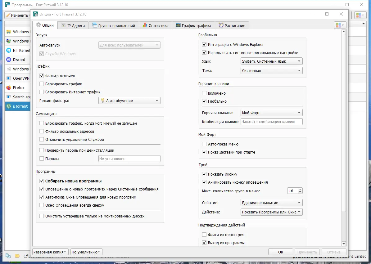 Программа включает защиту от несанкционированного отключения: при завершении работы Fort Firewall весь сетевой обмен блокируется до её повторного запуска.