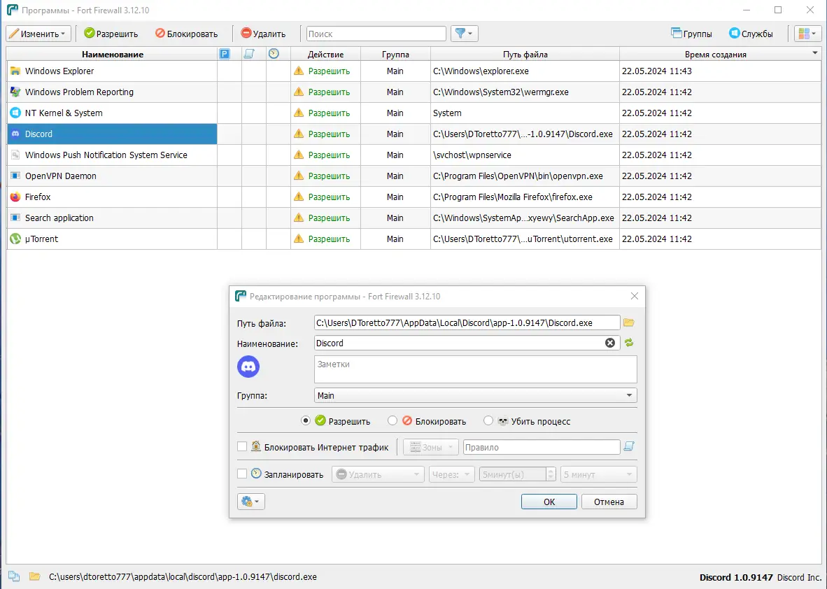 Fort Firewall построен на платформе Windows Filtering Platform, что обеспечивает его стабильную работу и минимальное влияние на производительность системы. Благодаря интеграции с ядром ОС, программа эффективно фильтрует входящий и исходящий трафик, блокируя нежелательные соединения. Пользователь может настроить правила для отдельных приложений, служб или IP-адресов, а также задать временные ограничения доступа.