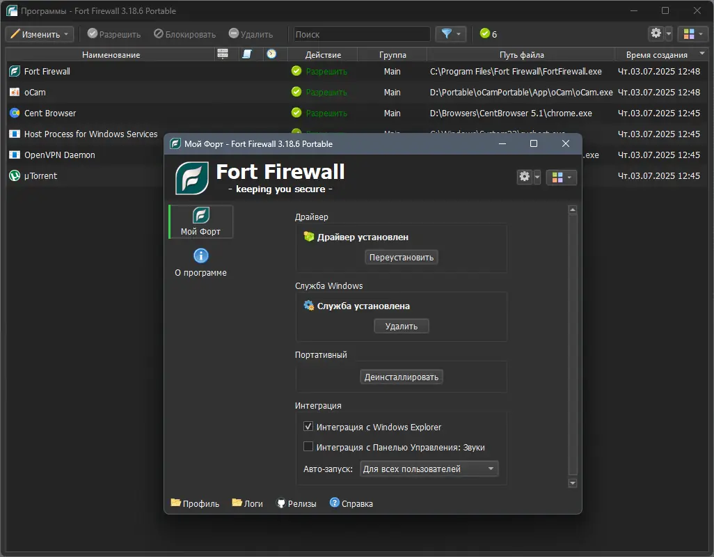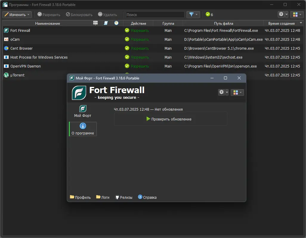 Благодаря простоте интерфейса и мощной основе на WFP, Fort Firewall сочетает в себе надёжность и удобство для повседневного использования.