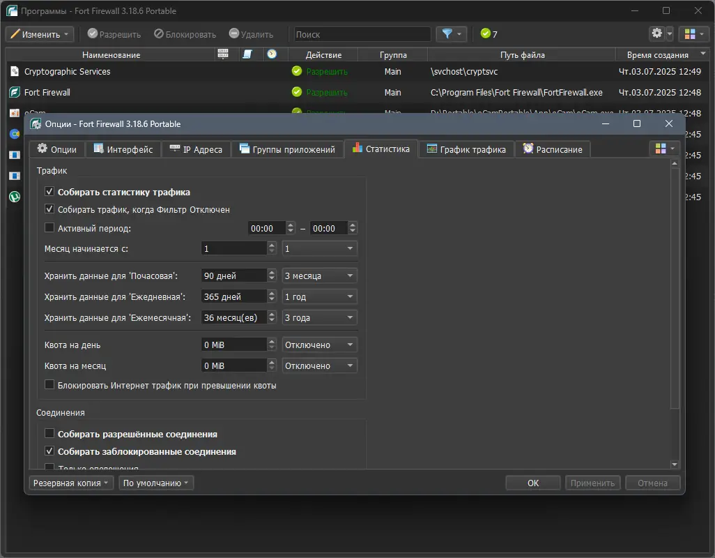 После установки программа начинает отслеживать все сетевые подключения в реальном времени. Пользователю предлагается интерфейс, где отображаются активные процессы, их сетевая активность и текущие правила фильтрации. При первом подключении к интернету Fort Firewall запрашивает разрешение на доступ для каждой программы, позволяя сразу сформировать правила. Далее можно настроить ограничения по скорости для отдельных приложений, что полезно при совместном использовании канала. Фильтрация по группам приложений упрощает управление — например, можно запретить доступ в интернет всем сторонним утилитам разом. Для опытных пользователей доступна настройка фильтров по именам служб и сетевым адресам. Панель статистики отображает график трафика, что помогает выявить приложения с высоким потреблением данных. Пароль защищает конфигурацию от изменений посторонними лицами.