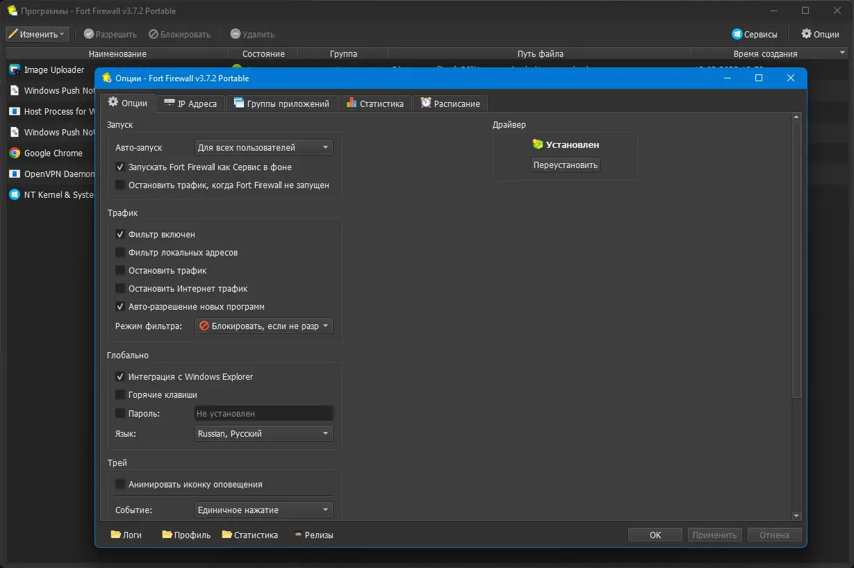 Fort Firewall — это лёгкий и бесплатный брандмауэр для операционных систем Windows, предназначенный для тонкого контроля сетевого трафика. Программа позволяет блокировать доступ в интернет отдельным приложениям, устанавливать фильтры по IP-адресам и настраивать правила фильтрации с высокой точностью. Решение построено на базе WFP и обеспечивает эффективную защиту без избыточной нагрузки на систему.