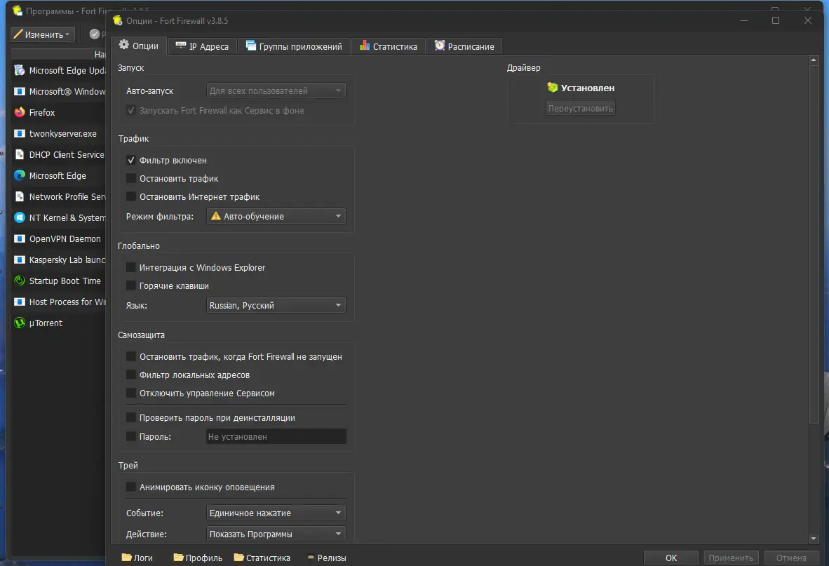 Программа использует собственный драйвер ядра, что гарантирует стабильность и высокую производительность фильтрации на уровне системы.
