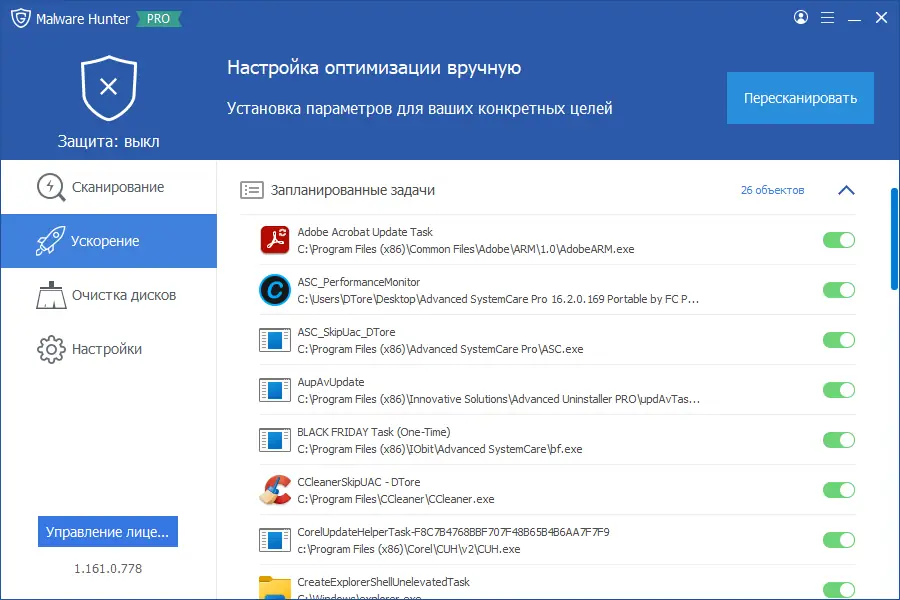 - Функция ускорения ПК оптимизирует автозагрузку, управляет фоновыми процессами и настраивает системные сервисы для улучшения отзывчивости компьютера.