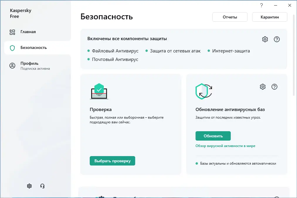 Kaspersky Free предлагает сбалансированную защиту при минимальном влиянии на производительность. Программа использует облачные аналитические механизмы, что ускоряет реакцию на новые угрозы. Однако из-за ограниченного функционала по сравнению с платными версиями она не подходит для комплексной защиты в сложных сетевых средах. Отсутствуют некоторые функции, такие как родительский контроль, защита веб-камеры или firewall. Тем не менее, для базовой безопасности частного компьютера этого достаточно.
