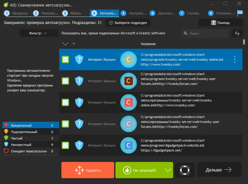 Программа разделяет найденные элементы на категории: вредоносные, подозрительные, неизвестные и безопасные, что позволяет точно оценить риски.