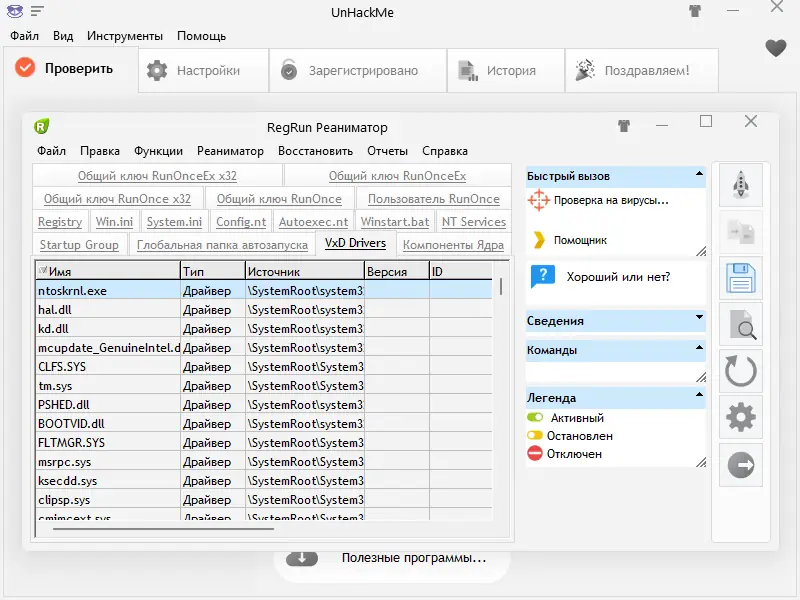 - Сканирует реестр и файловую систему на предмет следов удалённых, но оставшихся активными вредоносных программ.