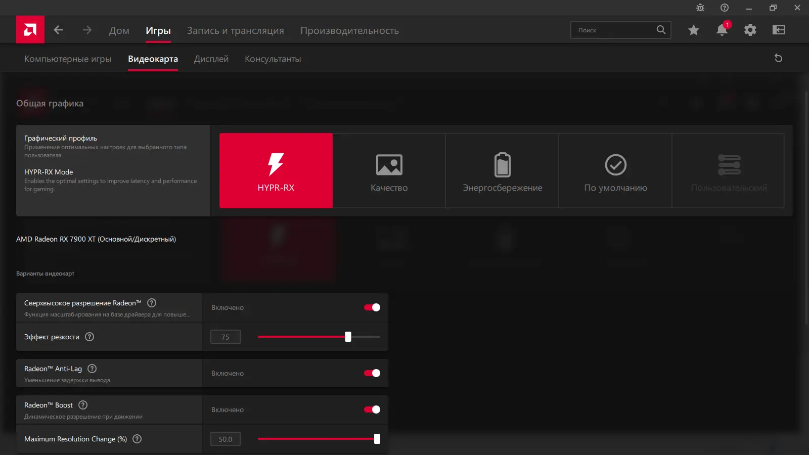 После завершения установки программа автоматически распознает установленное оборудование и предлагает оптимальные настройки. Через вкладку «Игры» можно настроить профили для отдельных приложений, включая параметры графики, стриминг и горячие клавиши. Интерфейс разделен на логические блоки: домашняя страница, игры, производительность, стриминг и настройки. Доступ в меню осуществляется как с рабочего стола, так и через горячую клавишу во время игры. Пользователь может включать такие функции, как Radeon Anti-lag или Image Sharpening, в зависимости от требований к производительности и качеству изображения.