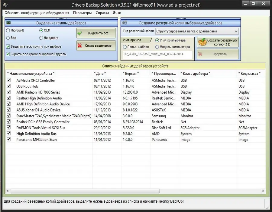 - Присутствует инструмент для резервного копирования уже установленных драйверов — Drivers Backup Solution