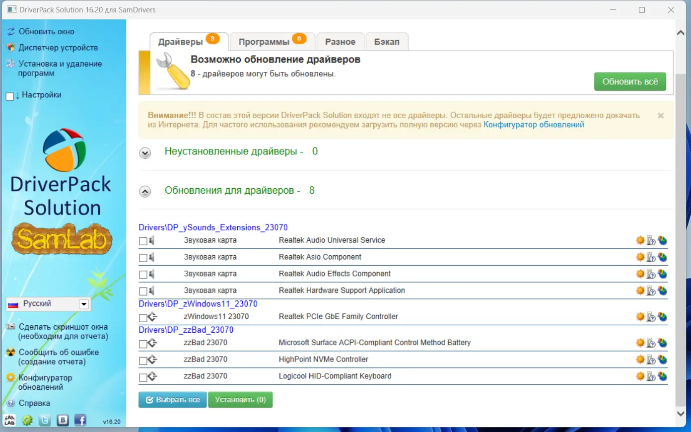 - Используются надёжные установщики: DriverPack Solution, Snappy Driver Installer и другие