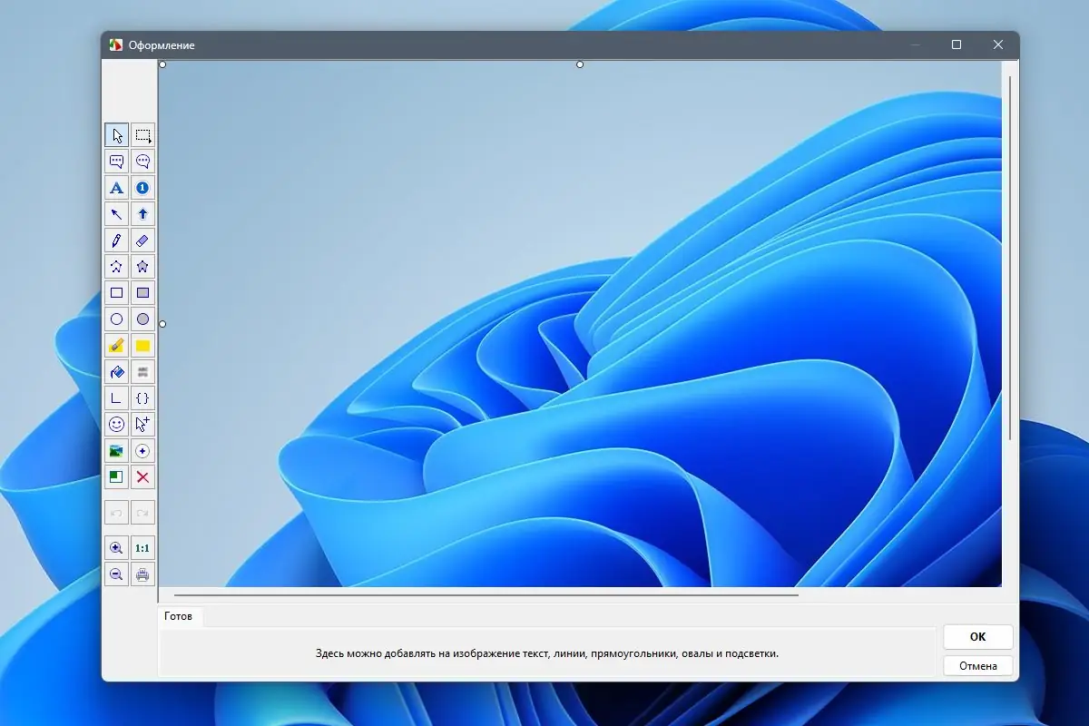 - Встроенный редактор поддерживает аннотации, добавление теней, рамок, изменение размера и цветовых параметров изображения.