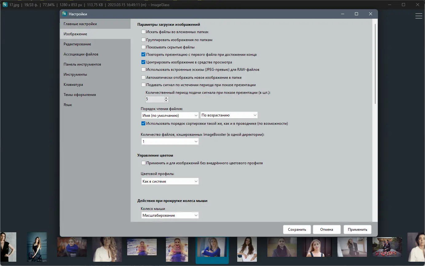 Использование программы не требует специальных навыков. После запуска достаточно перетащить изображение в окно приложения или открыть файл через проводник. Управление осуществляется как с помощью мыши, так и через горячие клавиши — например, колесо прокрутки позволяет быстро менять масштаб, а клавиша пробела переключает изображения в режиме просмотра. В настройках можно изменить тему интерфейса, задать поведение при открытии файлов, настроить автоматический запуск слайд-шоу и активировать дополнительные модули.