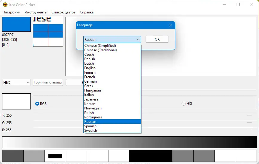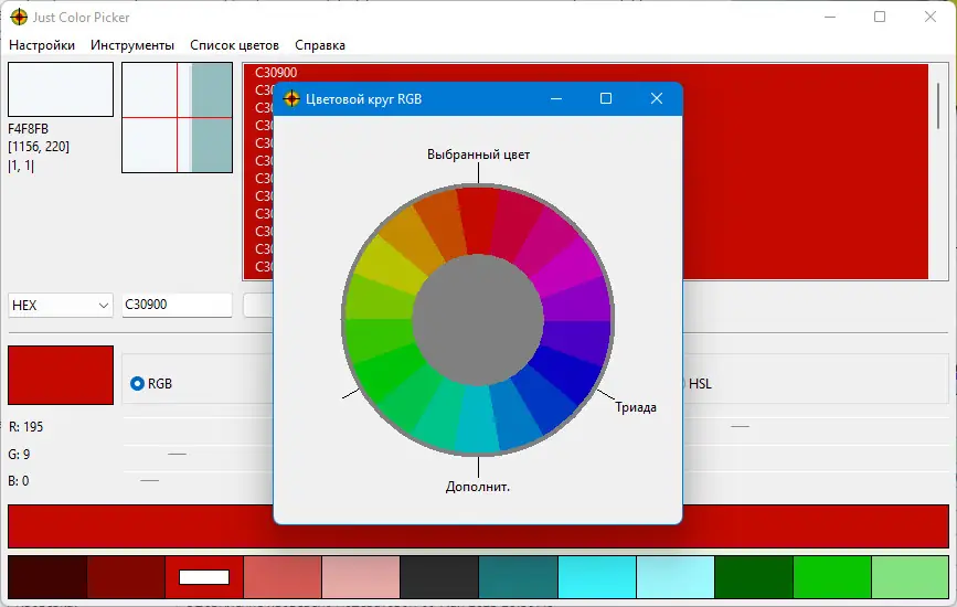 Just Color Picker — это компактное и функциональное приложение для точного определения цветовых значений на экране. Программа позволяет мгновенно получить код цвета любого пикселя в различных форматах, включая HTML, HEX, RGB, HSB и HSL. Благодаря портативности и отсутствию необходимости в установке, инструмент удобен для дизайнеров, верстальщиков и всех, кто работает с цветом в цифровой среде.