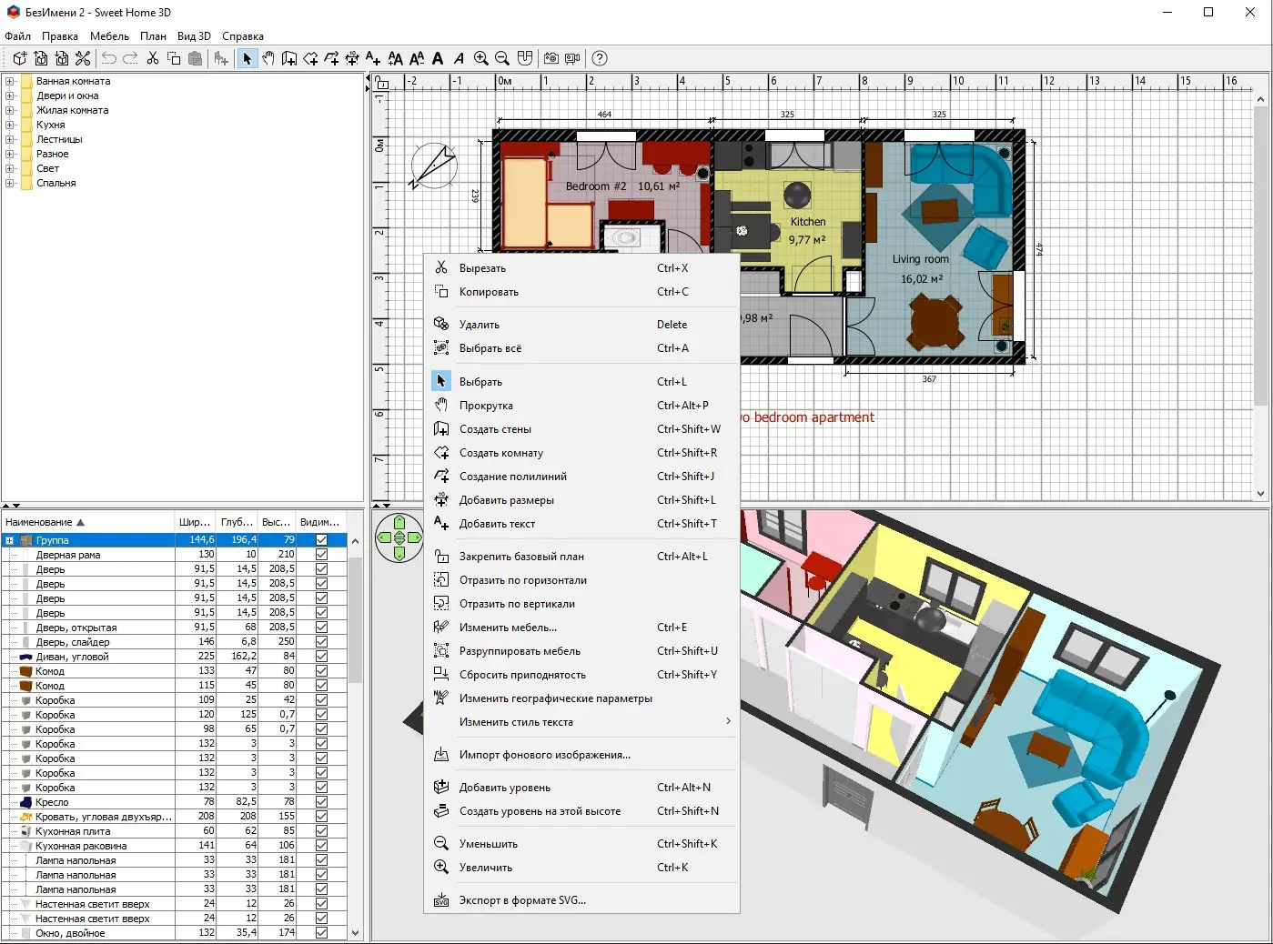 - Большая библиотека объектов: мебель, техника, освещение, декор