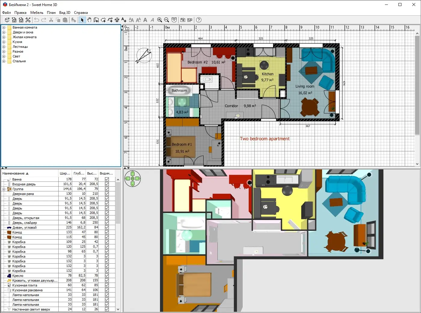 Sweet Home 3D — это программа для проектирования интерьера и планировки жилых помещений с визуализацией в 2D и 3D. Приложение позволяет создавать точные планы дома, расставлять мебель, подбирать текстуры и материалы, а также просматривать результат в режиме реального времени. Интуитивно понятный интерфейс и поддержка русского языка делают инструмент доступным как для новичков, так и для опытных пользователей.