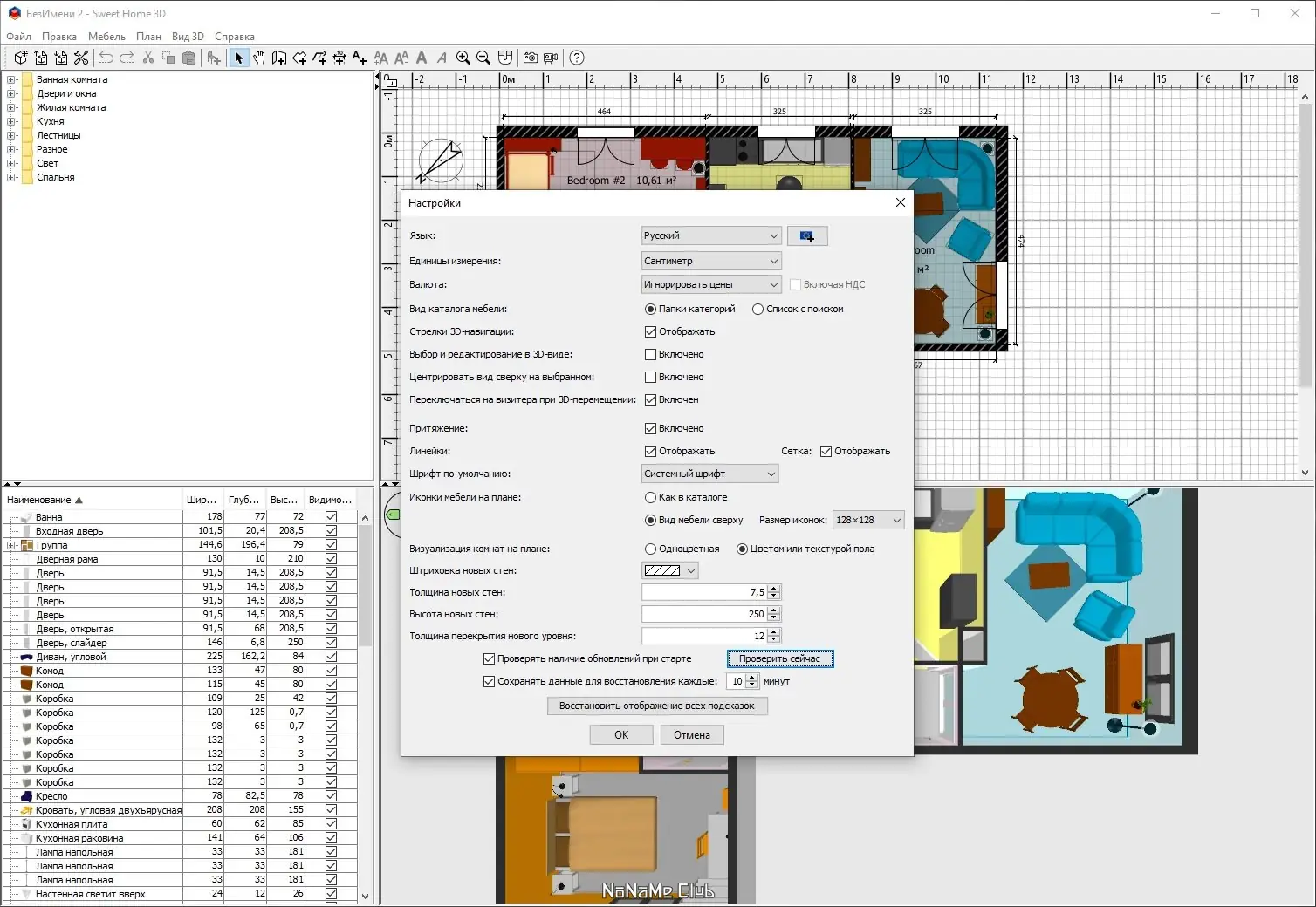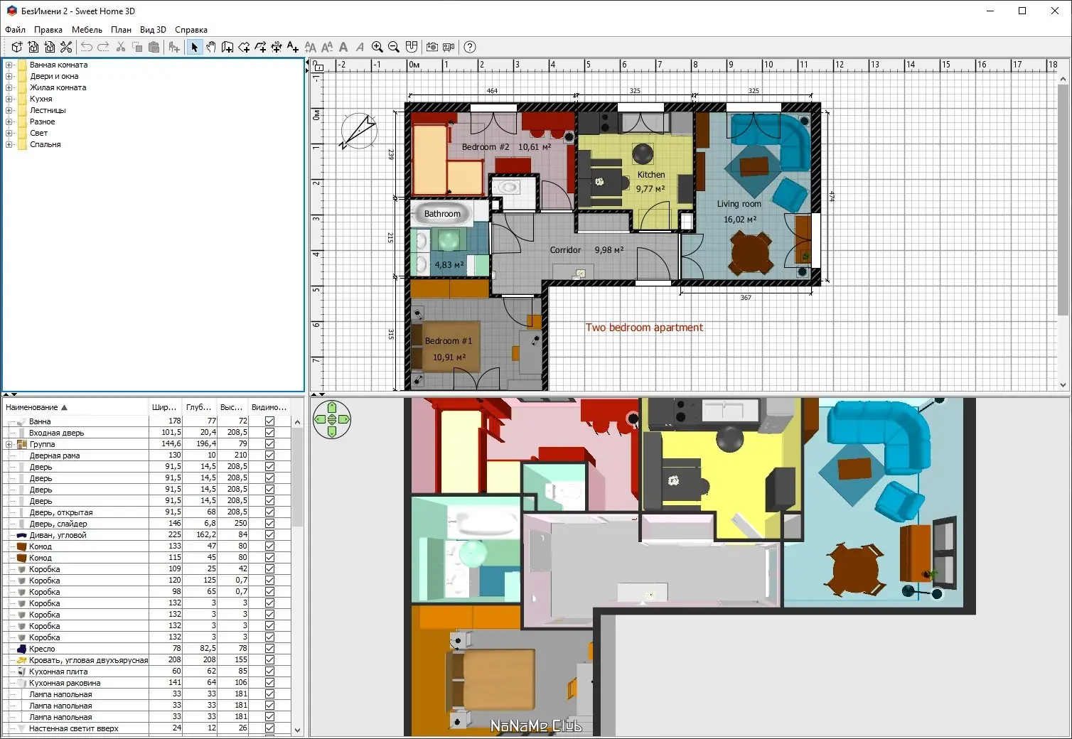 - Программа поддерживает одновременное отображение 2D-плана и 3D-модели в реальном времени.
