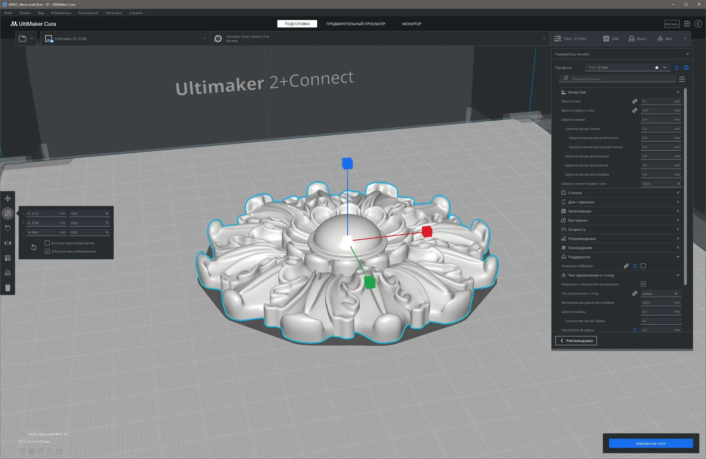 - Поддержка большого количества моделей принтеров и возможность тонкой регулировки параметров слайсинга