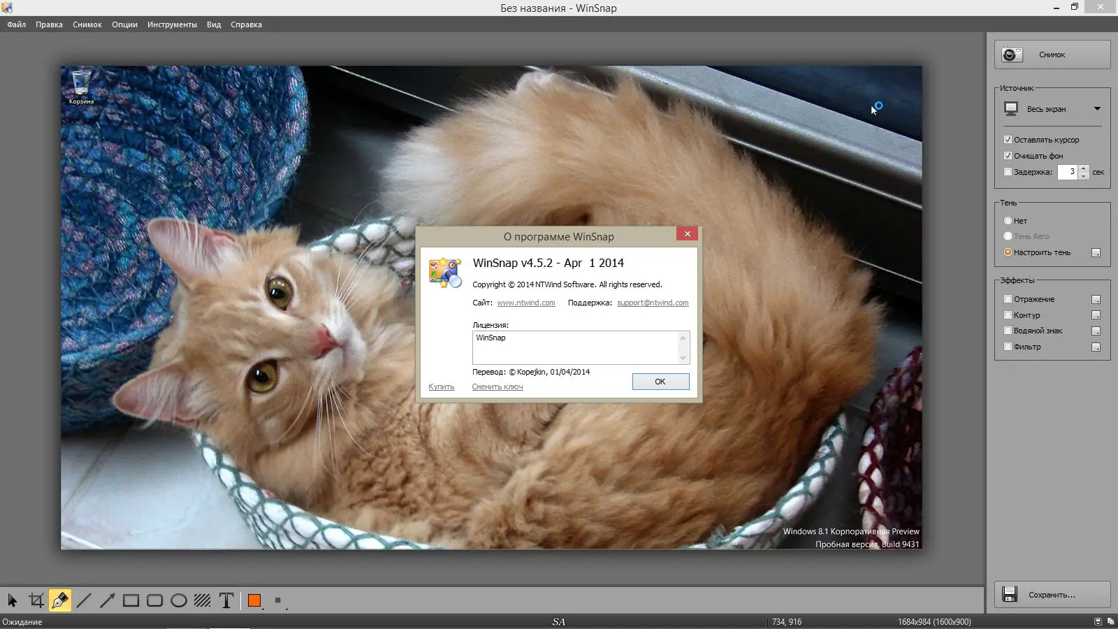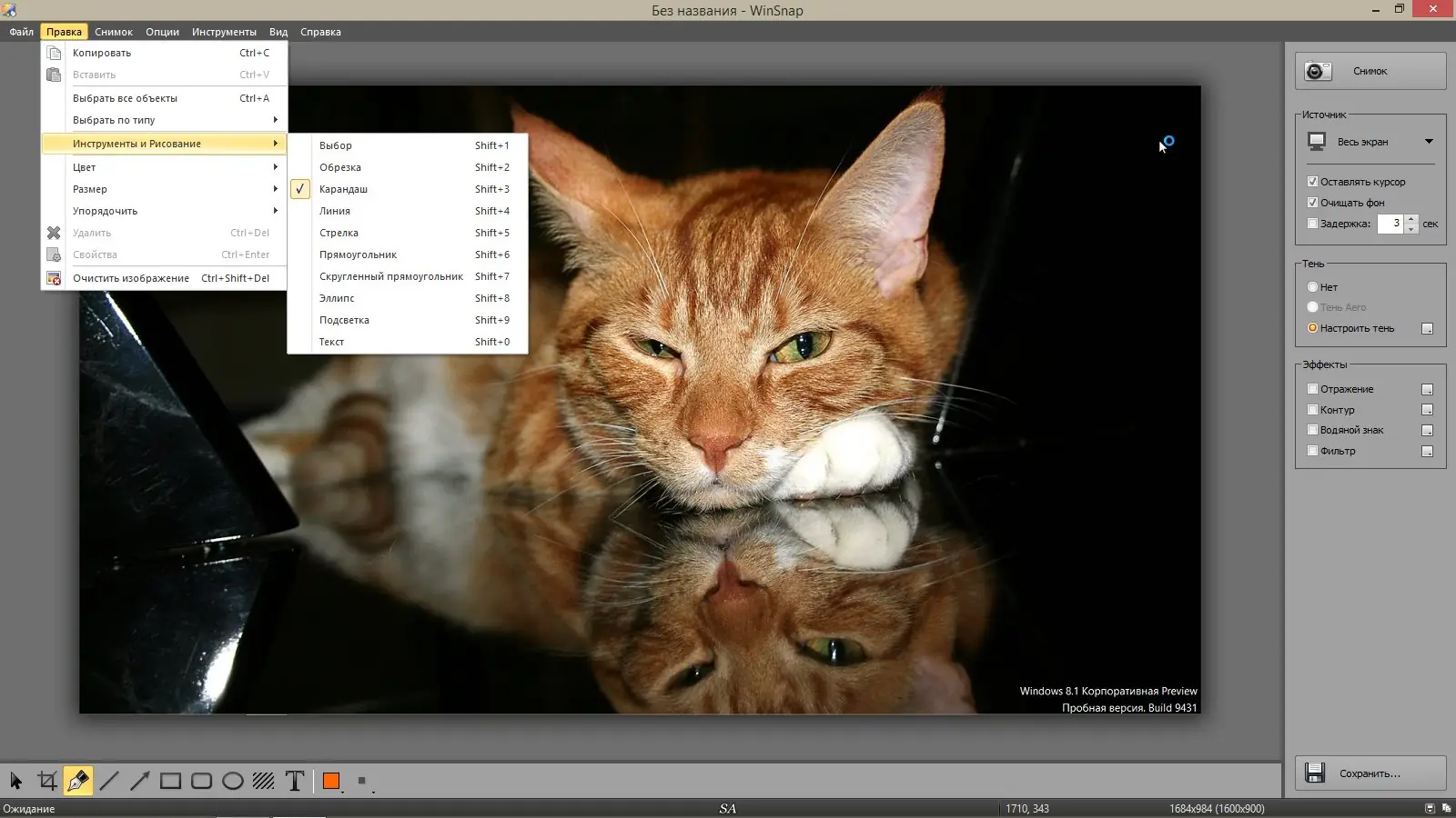 - WinSnap поддерживает наложение теней, контуров, отражений, а также поворот изображений и добавление водяных знаков.