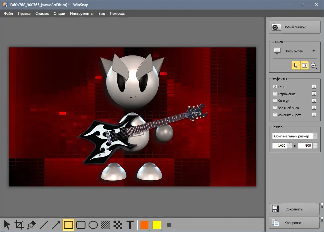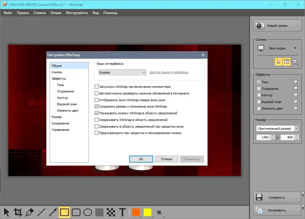 Работа с WinSnap начинается с выбора режима захвата: полный экран, активное окно, область или свободная форма. Перед съёмкой можно установить задержку от одной до тридцати секунд, чтобы успеть подготовить нужное состояние интерфейса. После захвата изображение автоматически открывается в редакторе программы, где доступны инструменты для добавления эффектов, обрезки, поворота и наложения водяных знаков.