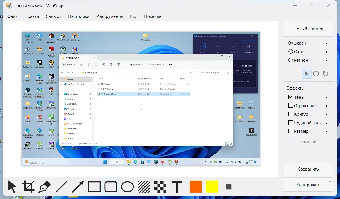 WinSnap эффективно справляется с захватом окон нестандартной формы, включая элементы с закруглёнными краями и прозрачностью, что редко встречается в аналогичных утилитах.