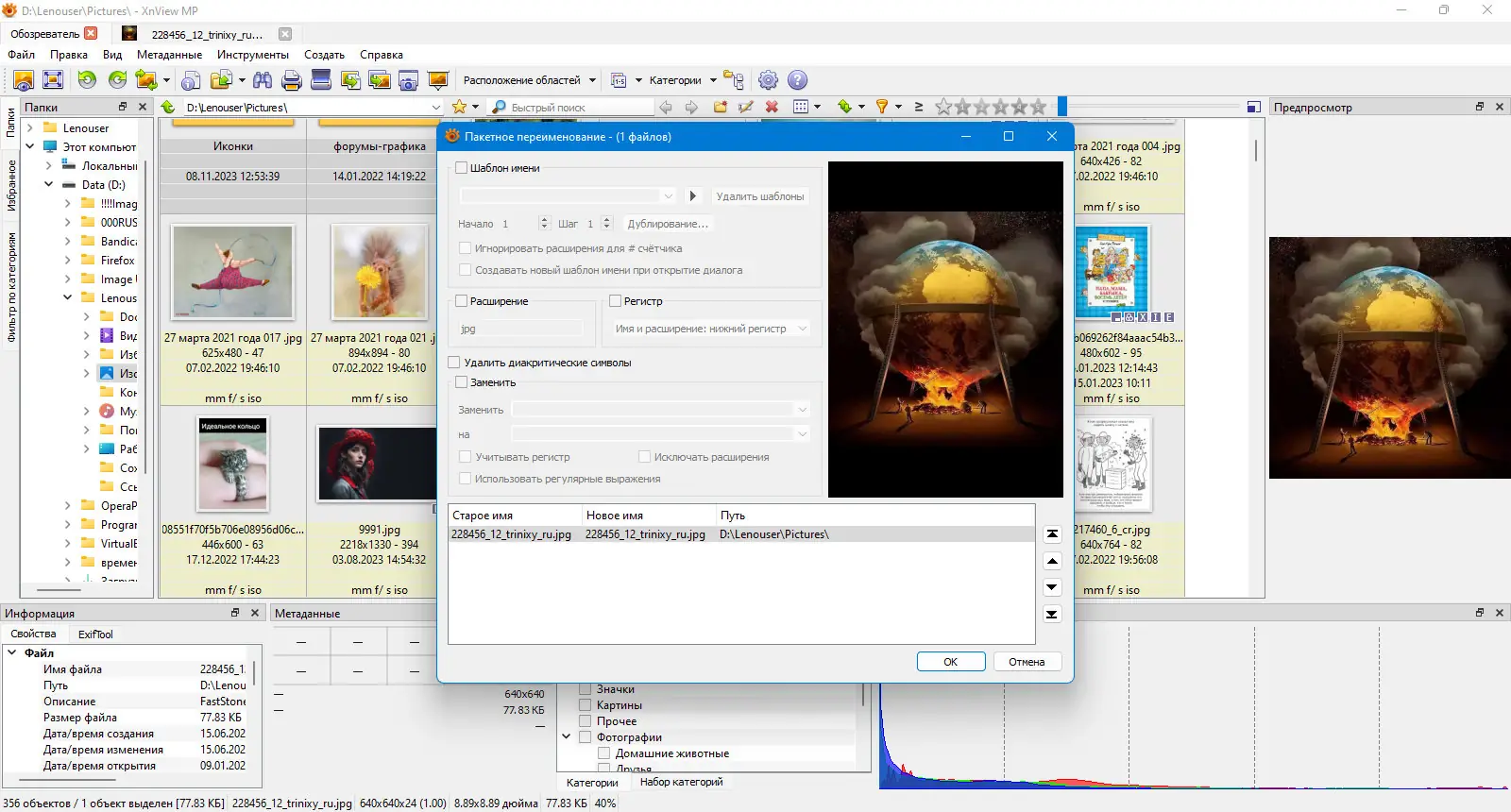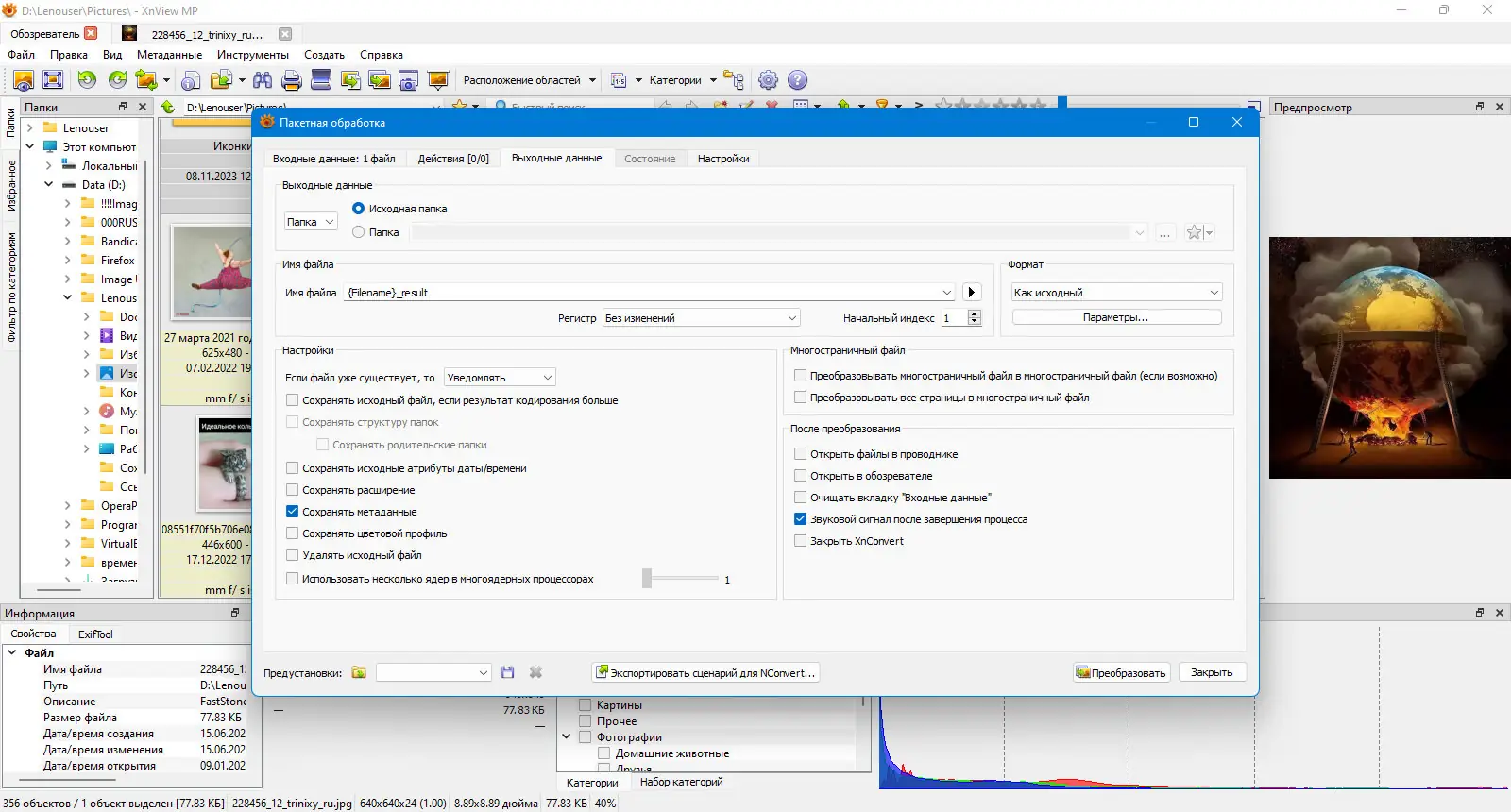 Интерфейс XnViewMP интуитивно понятен и напоминает классический проводник, что упрощает навигацию по папкам и файлам. Панель превью позволяет быстро оценивать изображения без открытия каждого в отдельном окне, а встроенный браузер поддерживает тегирование, рейтинг и фильтрацию по критериям. Для пакетной обработки доступен мощный конвертер, где можно задать формат, размер, качество и применить эффекты ко всем выбранным файлам. Редактирование включает в себя базовые операции — обрезку, поворот, изменение яркости, контраста и насыщенности, а также применение фильтров, таких как размытие, резкость, монохром и другие. Поддержка скриптов и плагинов расширяет возможности автоматизации рабочих процессов.